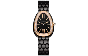 In 2019, Bulgari has reimagined one of its legends in a slimmer and equally sensual case, sporting a bracelet with hexagonal scales. The Serpenti has thus been transformed into the Serpenti Seduttori. The model now appears attired in black, the ‘non-colour’ that is at once historical and futuristic. Its case features the distinctive teardrop-shaped watch head, while its supple, second skin-like bracelet gently hugs the wrist. The two references convey a strong message, a glamour manifesto in a 33 mm steel case featuring a DLC treatment with powerfully complimentary black textures. Its rose gold bezel makes a perfect match with the dark side of the timepiece, available in either a classic edition or in a flamboyant iteration set with 38 round brilliant-cut diamonds (0.38ct). Both treasures house a quartz movement and are fitted with a dainty and ingenious folding clasp.