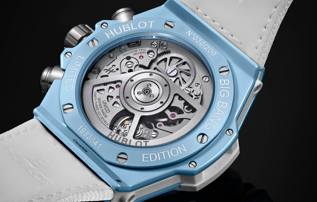 Fly with the colours of the Big Bang Unico Sky Blue 42 mm on your wrist. A shimmering sky lends a light, playful hint of freedom to the ceramic of the case. A limited edition of just 200 pieces, the dial reveals the column wheel of the HUB1280 manufacture calibre, a self-winding chronograph movement with a 72-hour power reserve.The white luminescent hands and indices, which appear suspended, mark the hours spent in joyous reunions. Hublot’s six iconic screws stand out against the blue of the bezel, which is also made from polished and satin- finished ceramic. The new Summer edition of the Big Bang Unico comes with a Velcro strap with sports fastener, as well as its iconic lined natural rubber version with a titanium deployant buckle.