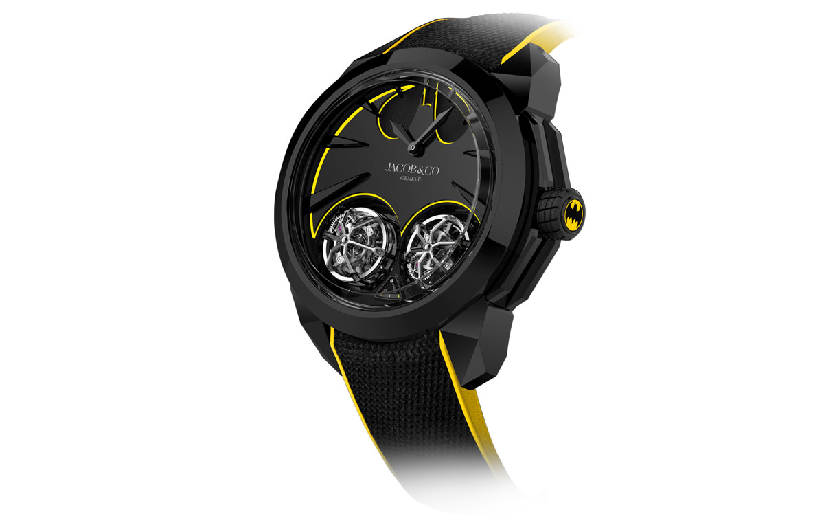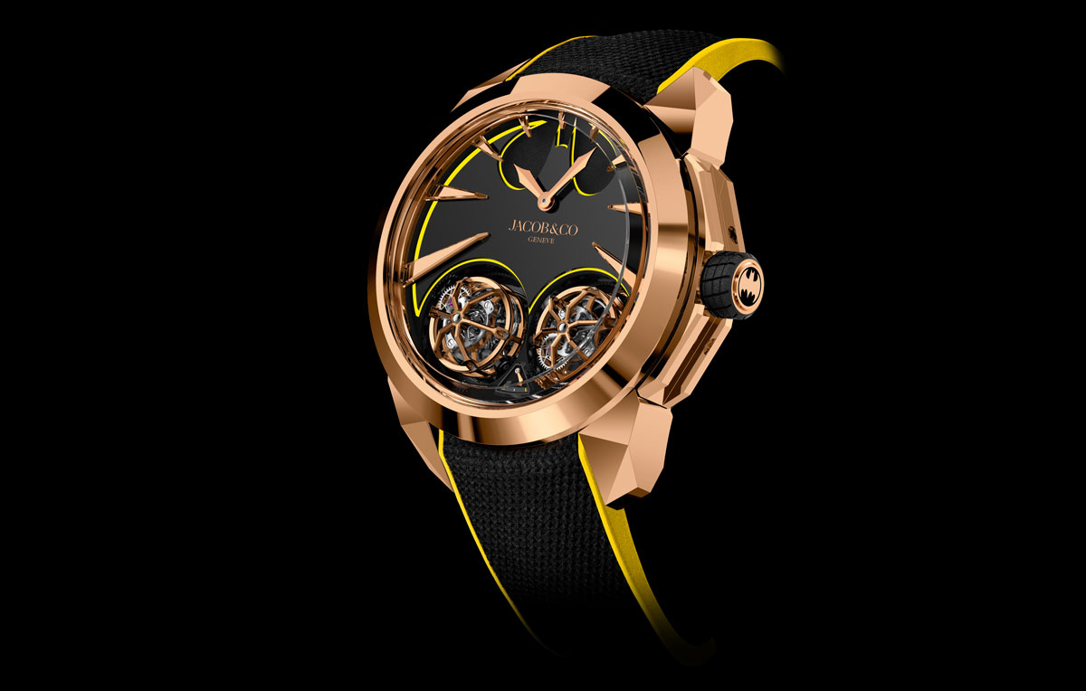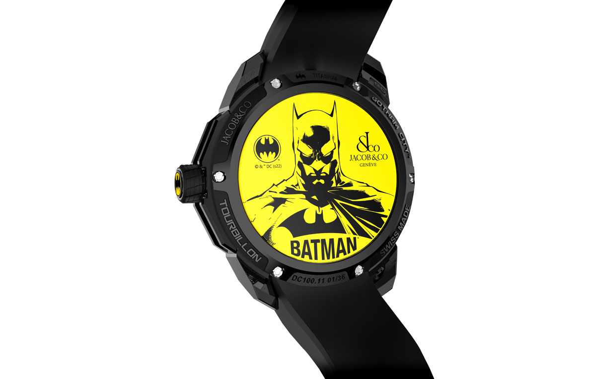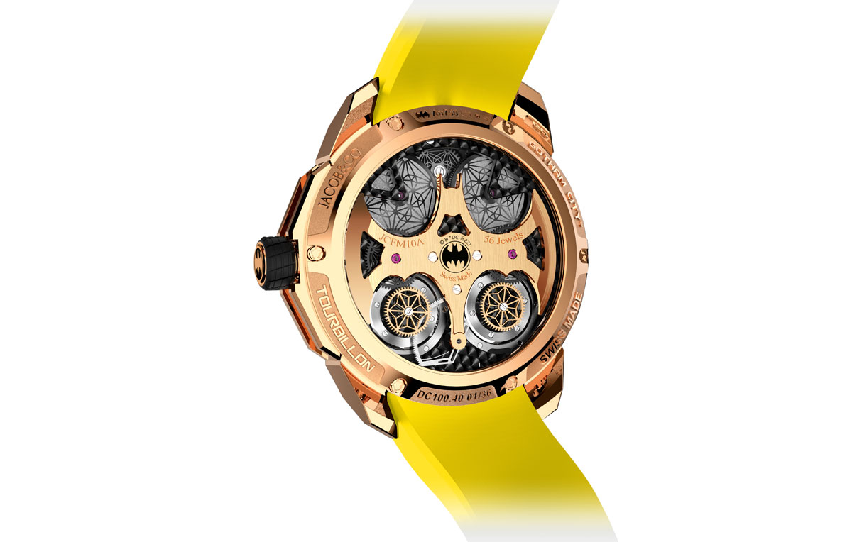 To top it all off, the tourbillons inside the Jacob & Co Gotham City timepiece are a flying kind -fitting for this legendary superhero who leaps in the air, travels in a winged hovering machine and responds to a signal etched on clouds. This unique timepiece brings a whole new heroic dimension to your watch collection.