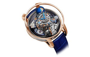 At its center, as with all versions of the Astronomia, is the unprecedented Astronomia movement with its vertical construction and four perfectly balanced arms, each attached to a novel rotating satellite. The time display has been moved from being one of the four satellites to the center of the movement. The movement platform rotates every 10 minutes inside the 50mm 18k rose gold and sapphire crystal case while floating above an aventurine base with a hand-painted depiction of the Milky Way galaxy with planets.