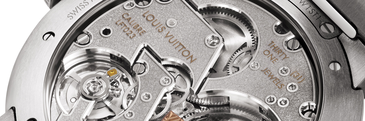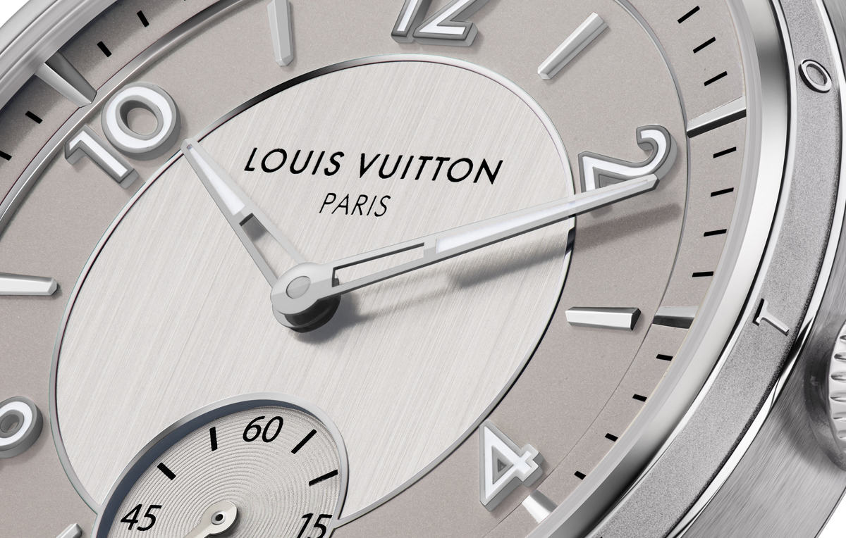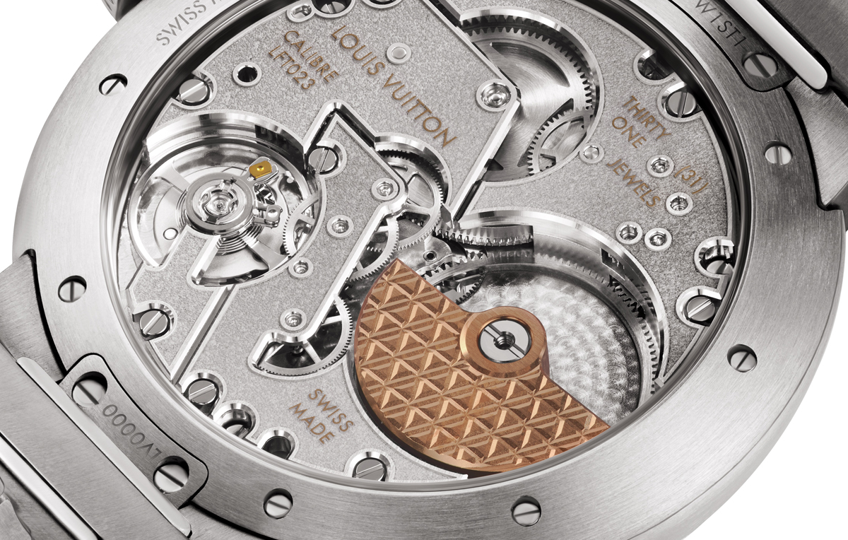 The new cal. LFT023 is more than the movement driving the evolved Tambour, it is also the first proprietary automatic three-hand movement designed by Louis Vuitton in conjunction with movement specialists Le Cercle des Horlogers to fully embody the Maison’s visual codes, from the barrel cover with openworking reminiscent of a Monogram Flower to the micro-rotor decorated with a stylised LV in a repeating motif.