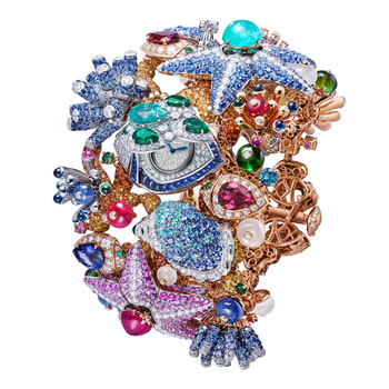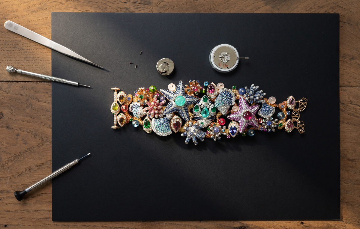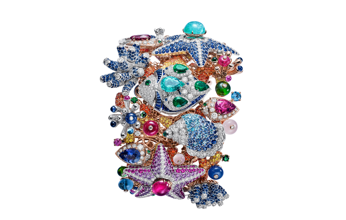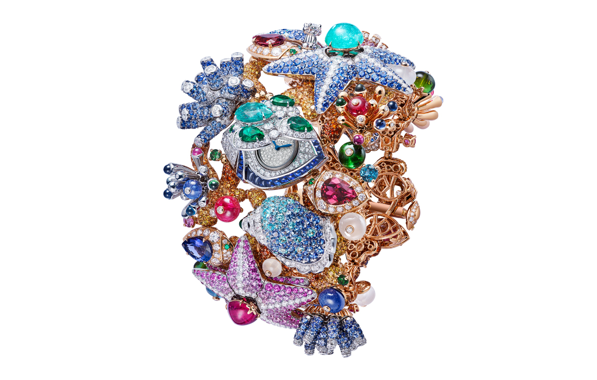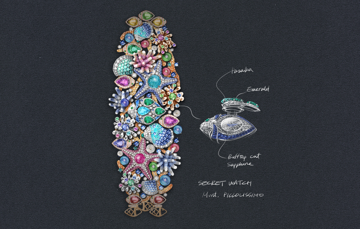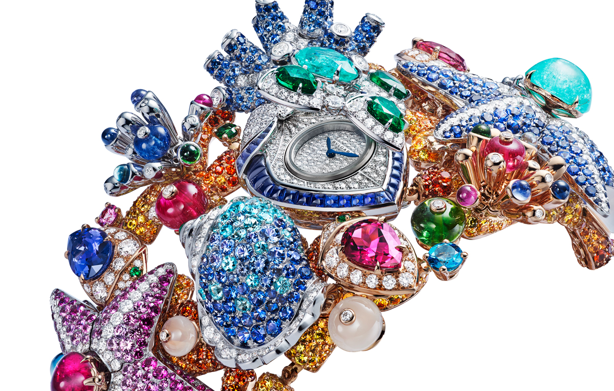 Giardino Marino Grande High Jewellery Secret Watch with Piccolissimo mechanical manufacture micro-movement, manual winding (2.5 mm thick), 30-hour power reserve and 21’600 Vph (3Hz) frequency, 18 kt rose and white gold case and bracelet set with diamonds, emeralds, blue and pink sapphires, Paraiba tourmalines, tanzanites, green and pink tourmalines, mandarin garnets, rubellites, peridots and rock crystals, and snow-set diamond dial. Detachable elements to be worn as earrings.