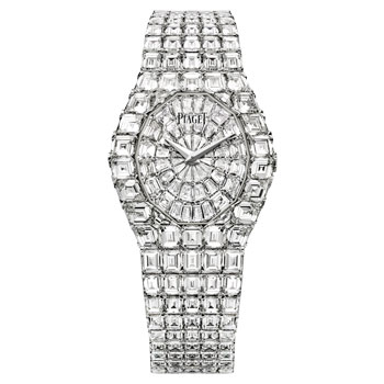 Taking center stage in the stunning diamond high jewelry category, the Limelight Aura High Jewelry watch features a case in rhodium finish 18K white gold set with 26 emerald-cut diamonds (approx. 8.8 ct) and 14 baguette-cut diamonds (approx. 0.8 ct). The exquisite dial is set with 52 emerald-cut diamonds (approx. 4.8 cts) and the bracelet in rhodium finish 18K white gold set with 210 emerald-cut diamonds (approx. 44.6 cts). The Limelight Aura High Jewelry watch features Manufacture 430P ultra-thin hand-wound mechanical movement.