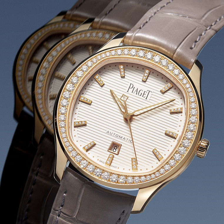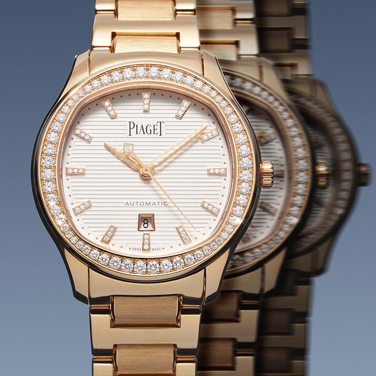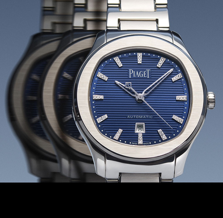 Piaget unveils two refined 36mm models in stainless steel with matching steel bracelets and a combination of polished and satin-finished details. One comes with a gorgeous deep Piaget blue dial and sparkling diamond-set gold indexes, while the other model features a pure white dial with a radiant diamond-set bezel that is paired with diamond-set gold indexes. As well as two exquisite rose gold models with diamonds and snow-white dials with either slate grey alligator strap or a full gold rose gold bracelet. For lovers of gemsetting, Piaget presents two fully-paved models, one of which with a dark blue alligator strap and the other on a fully-paved diamond bracelet.