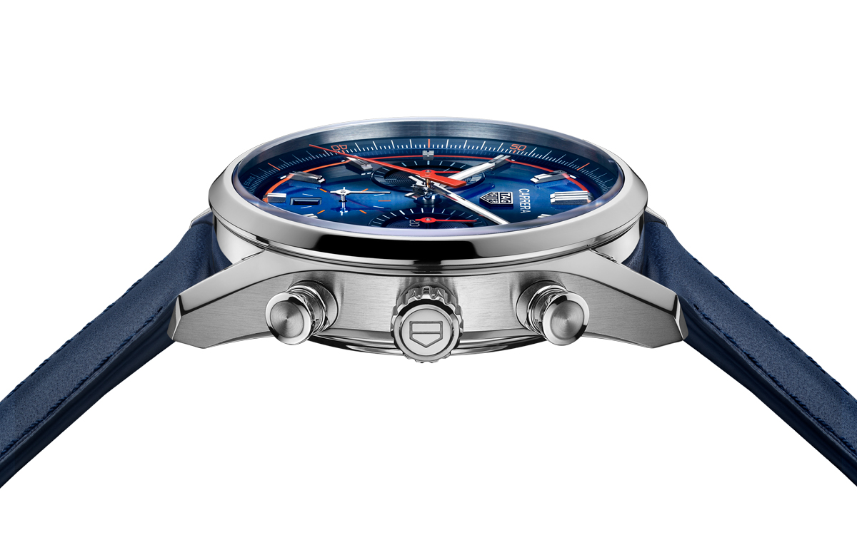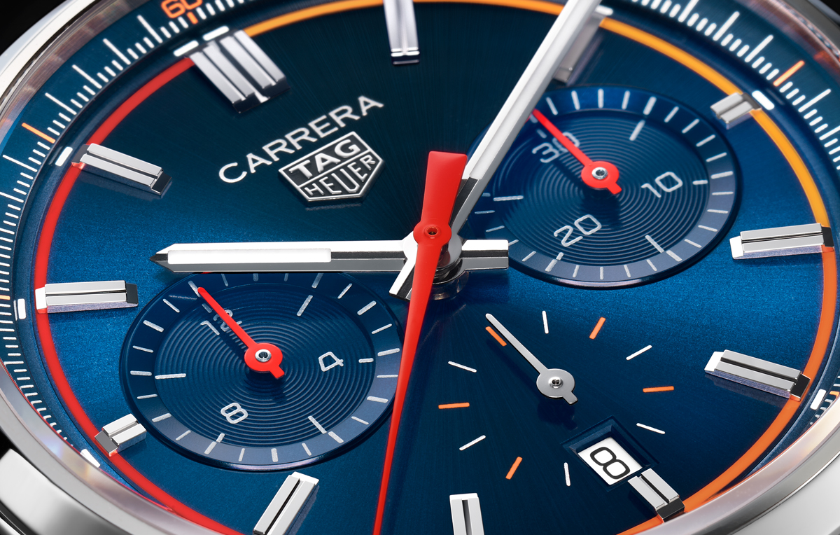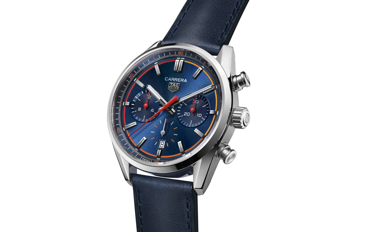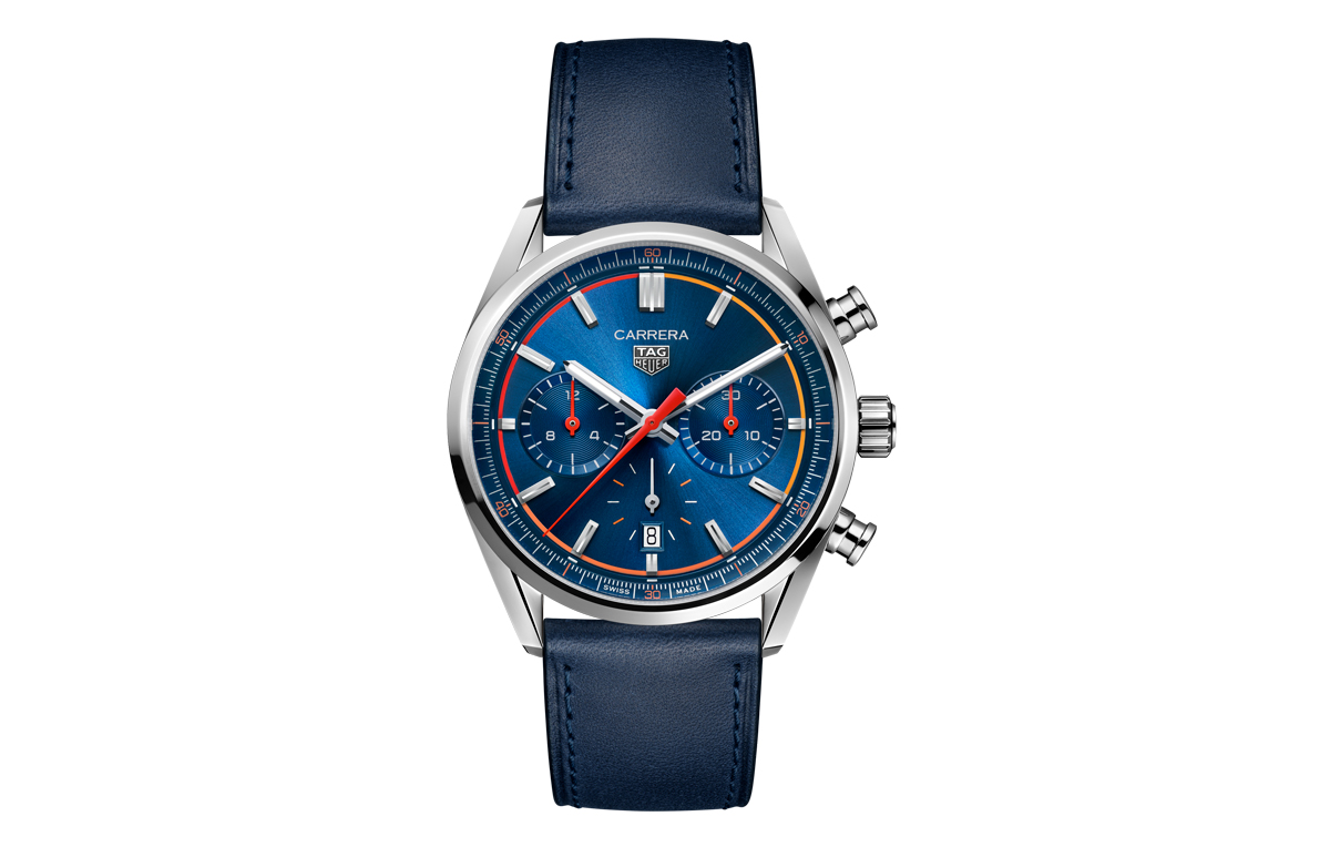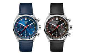 There are two new collection pieces, both with 42-mm stainless steel cases. The distinction is in the dial: a choice of blue or black, both decorated with vivid orange detailing that recalls classic race car speedometers. The new models are powered by TAG Heuer’s in-house automatic chronograph Heuer 02 movement. Both are finished with high-end calfskin straps.