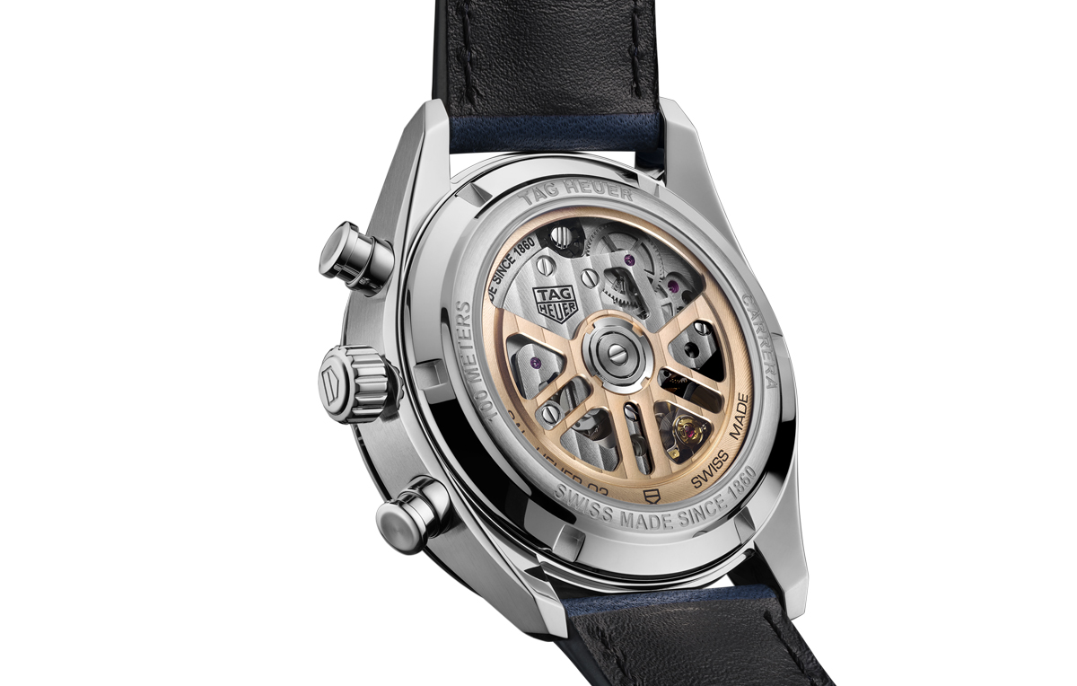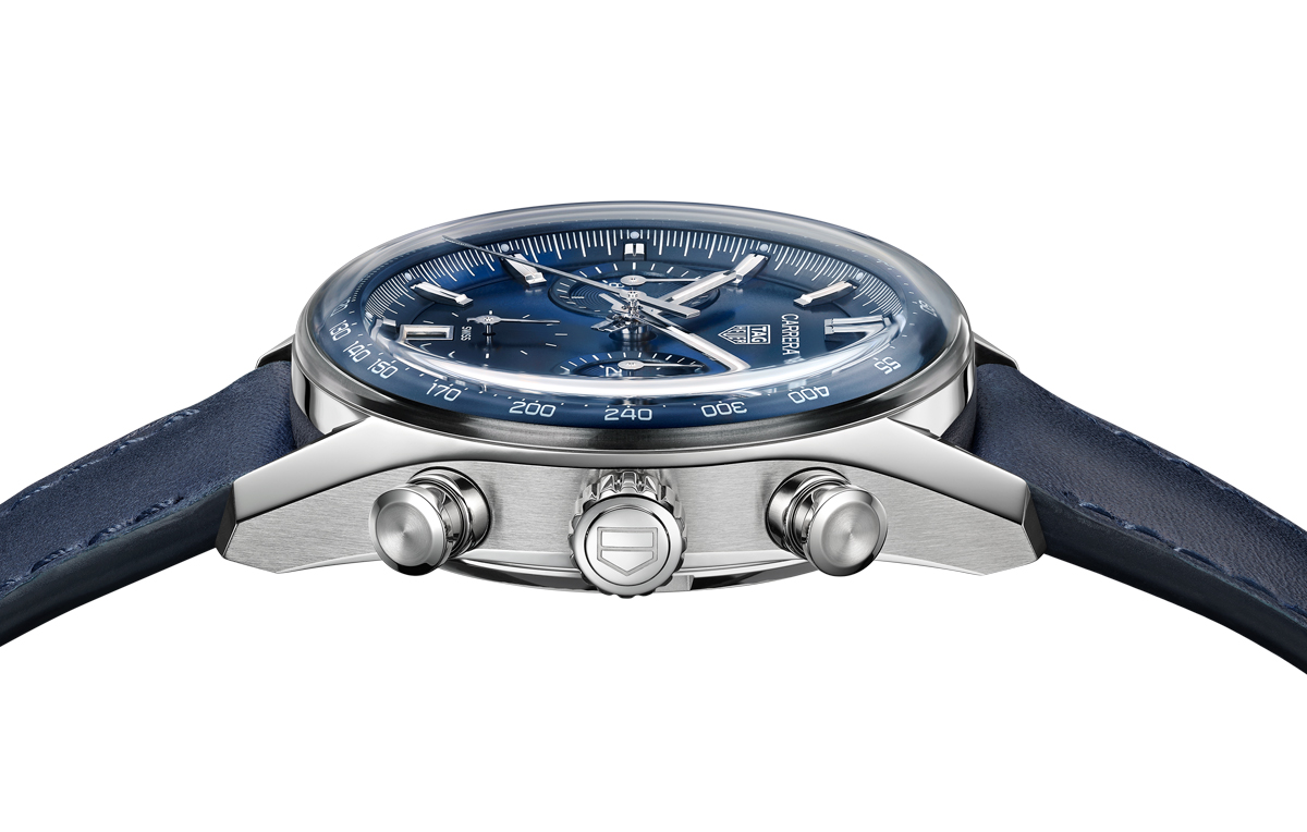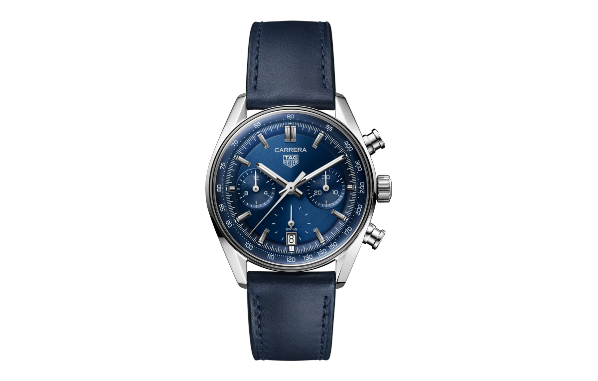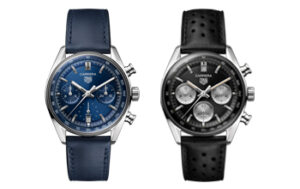 The chronograph novelties are presented in two models: one with a signature blue dial on a blue calfskin leather strap, and a second with a racier, black-and-silver “reverse panda” dial. Inside both iterations of the TAG Heuer Carrera Chronograph is an evolved version of TAG Heuer’s in-house automatic chronograph caliber, the Heuer 02.