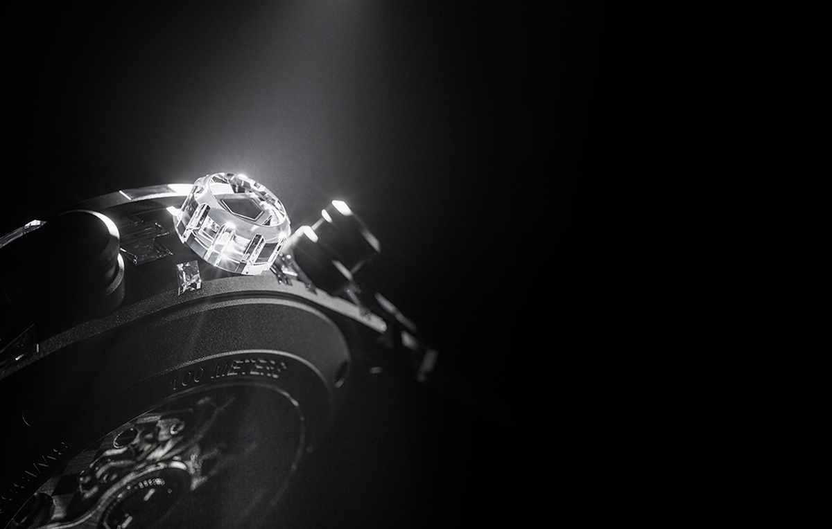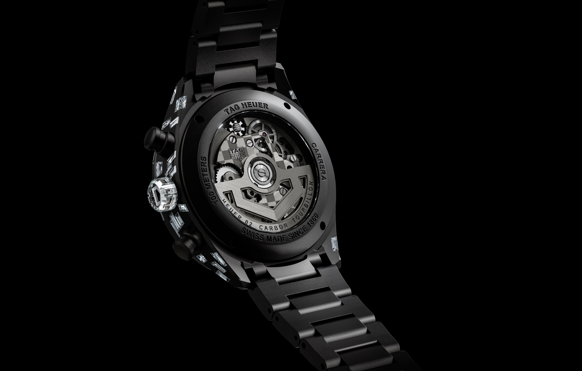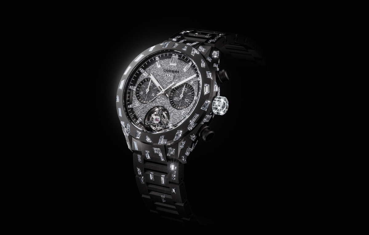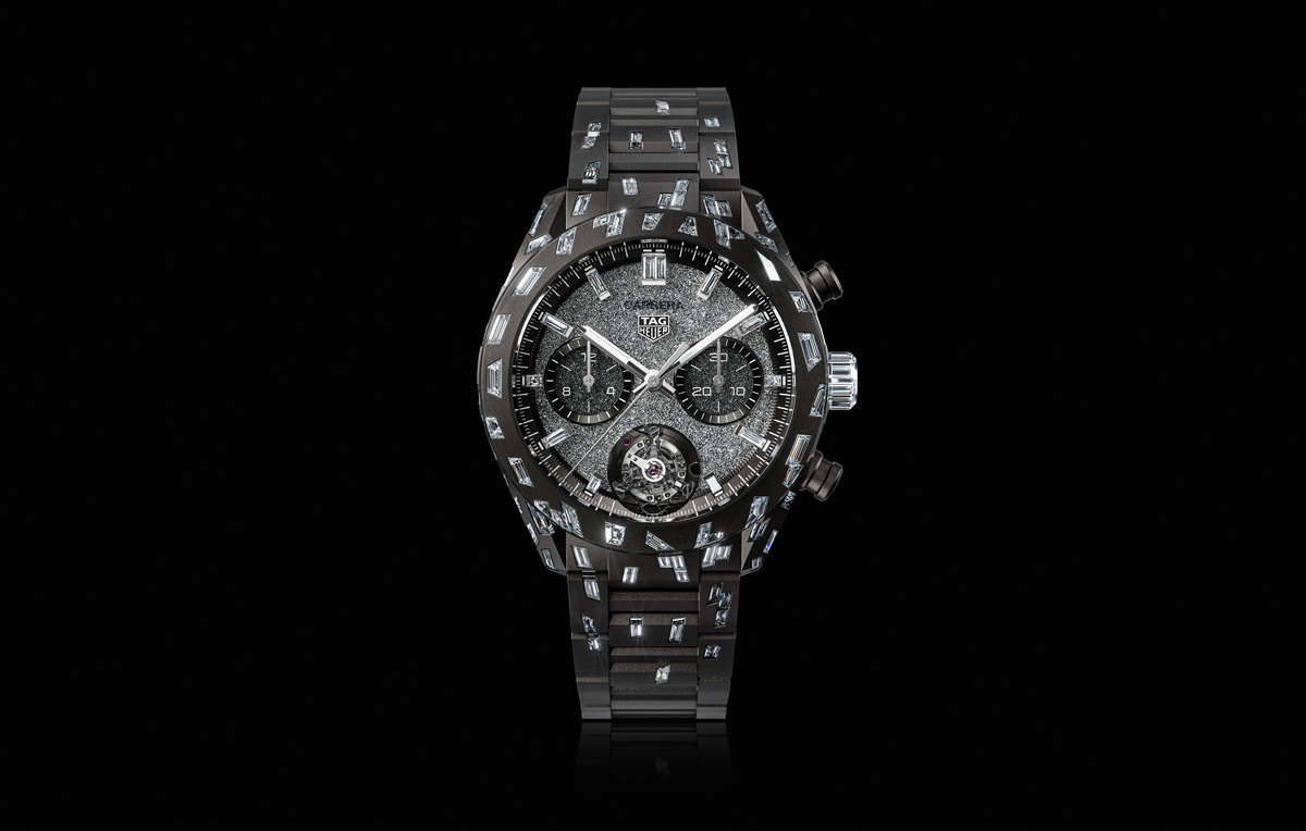 The crown is a single 2.5-carat lab-grown diamond, optimized in growth and cut for the sharpest, cleanest fit. Just as impressive is the watch’s top-of-the-line movement, the Calibre Heuer 02 Tourbillon Nanograph.