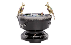 Combining on-demand animation and a retrograde time display, Fontaine aux Oiseaux automaton offers a double spectacle. On the side of the base, a feather moves progressively along the time scale. Once it reaches 12 o’clock, it returns to its point of departure to repeat its journey for the next half-day.