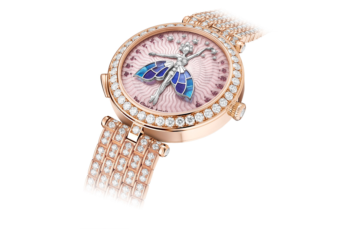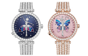 Originally created in 2013, this year Van Cleef & Arpels reinvents the Lady Arpels Ballerines Enchantées in two new pieces suffused with grace and modernity, one in white and the other in rose gold. The dancer’s graceful silhouette has been revisited, with her posture taking on a slender and dynamic attitude, while her tutu unfurl in new materials and colors. Depicting a dancer part woman and part butterfly, these crea-tions follow in the footsteps of the ballerinas and fairies so dear to the Maison. On demand, the figure indicates the hours and minutes by raising its arms.