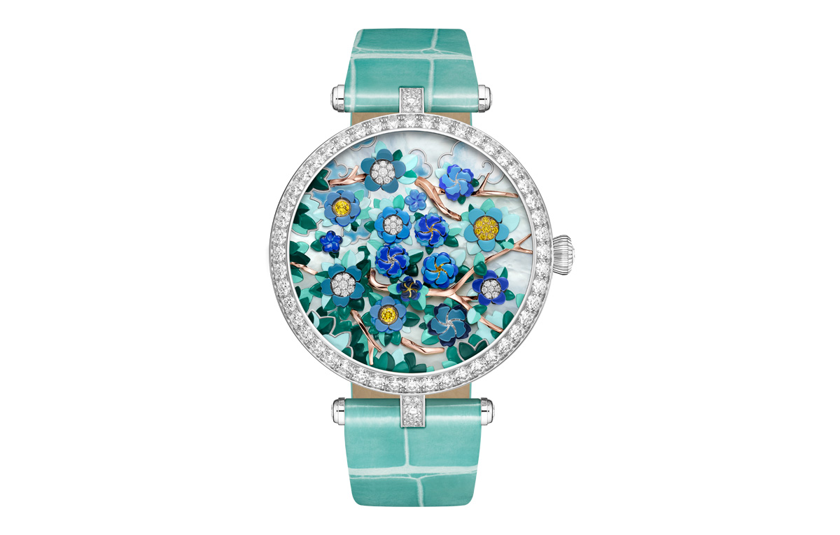 Drawing inspiration from the Swedish botanist Carl Von Linné in which he wrote about a garden plan made up of a variety of plants, whose flowers open and close at specific moments of the day to show the time, Van Cleef & Arpels has taken up this magical idea to bring two brand-new creations into being: the Lady Arpels Heures Florales and Lady Arpels Heures Florales Cerisier watches. Their three-dimensional dial offers a poetic rendition of the passage of time, thanks to the opening and closing of 12 corollas. Telling the time becomes a spectacle, as the flowers blossom and close, renewing the dial’s scenery every 60 minutes.