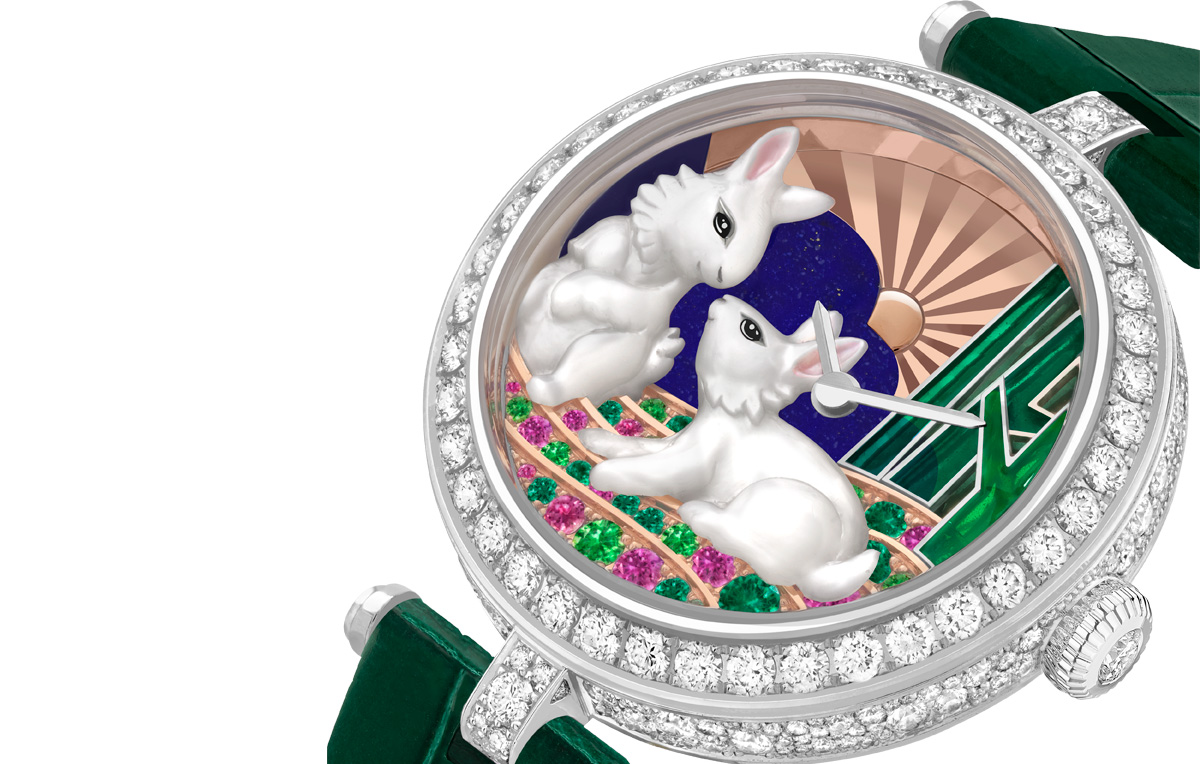 The new Lady Duo de Lapins’ sculpture on mother-of- pearl brings to life a pair of rabbits, exchanging tender glances. Around them, a garden of emeralds, tsavorite garnets and pink sapphires is home to vegetation in plique-à-jour enamel. The sun – in guilloché and mirror-polished rose gold – spreads intense reflections, while a cloud in lapis lazuli adds to the tableau’s impression of depth.