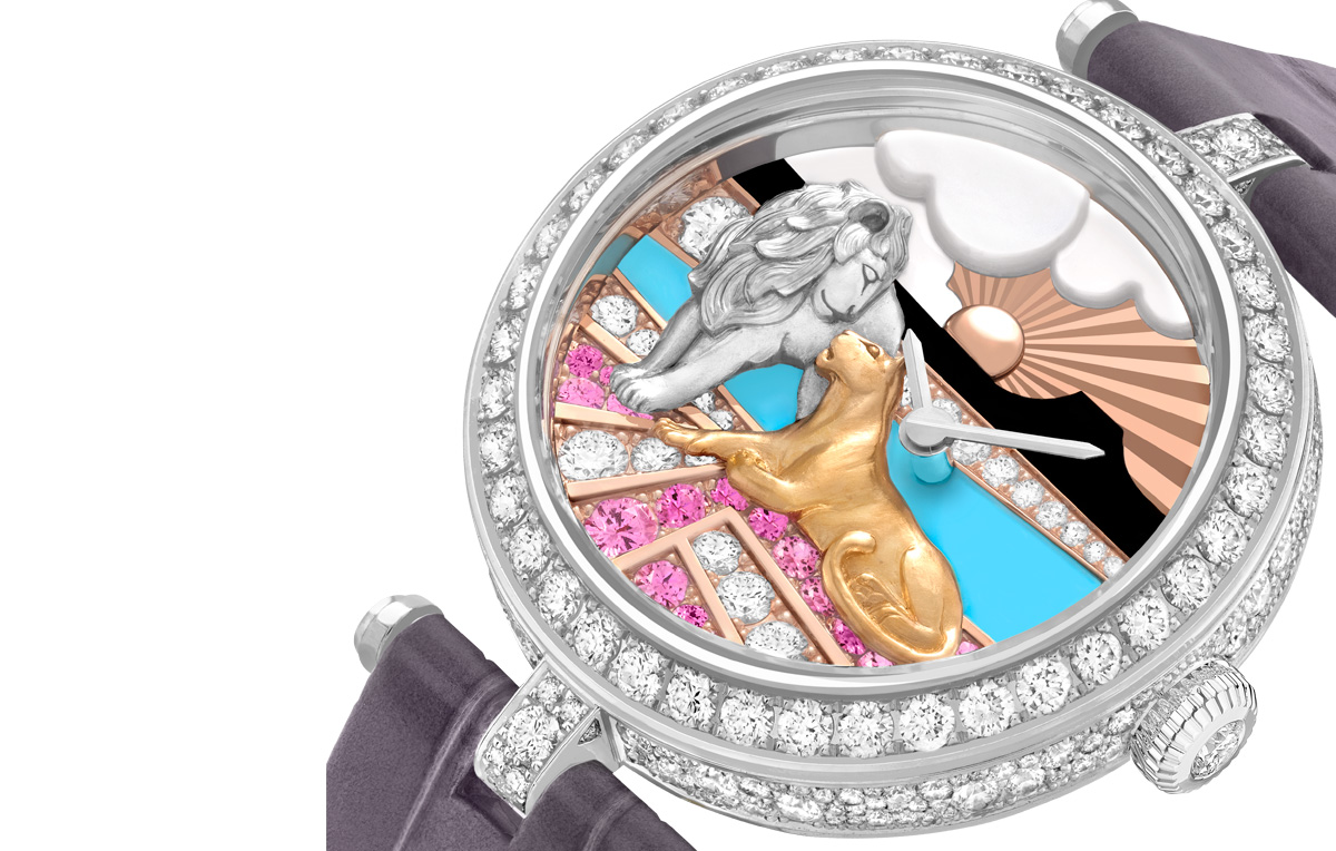 On the dial of the Lady Duo de Lions watch, in the foreground, a couple of lions is in-tricately sculpted in relief from white and yellow gold, with particular attention to the three-dimensional volume of the silhouettes and their polished coats. At their feet, a surface of diamonds and pink sapphires contrasts with a background of turquoise and onyx marquetry, traversed by round diamonds that suggest the shimmer of water in the sun. Depicted in mirror-polished and guilloché rose gold, the latter emerges from behind clouds of white mother-of-pearl.