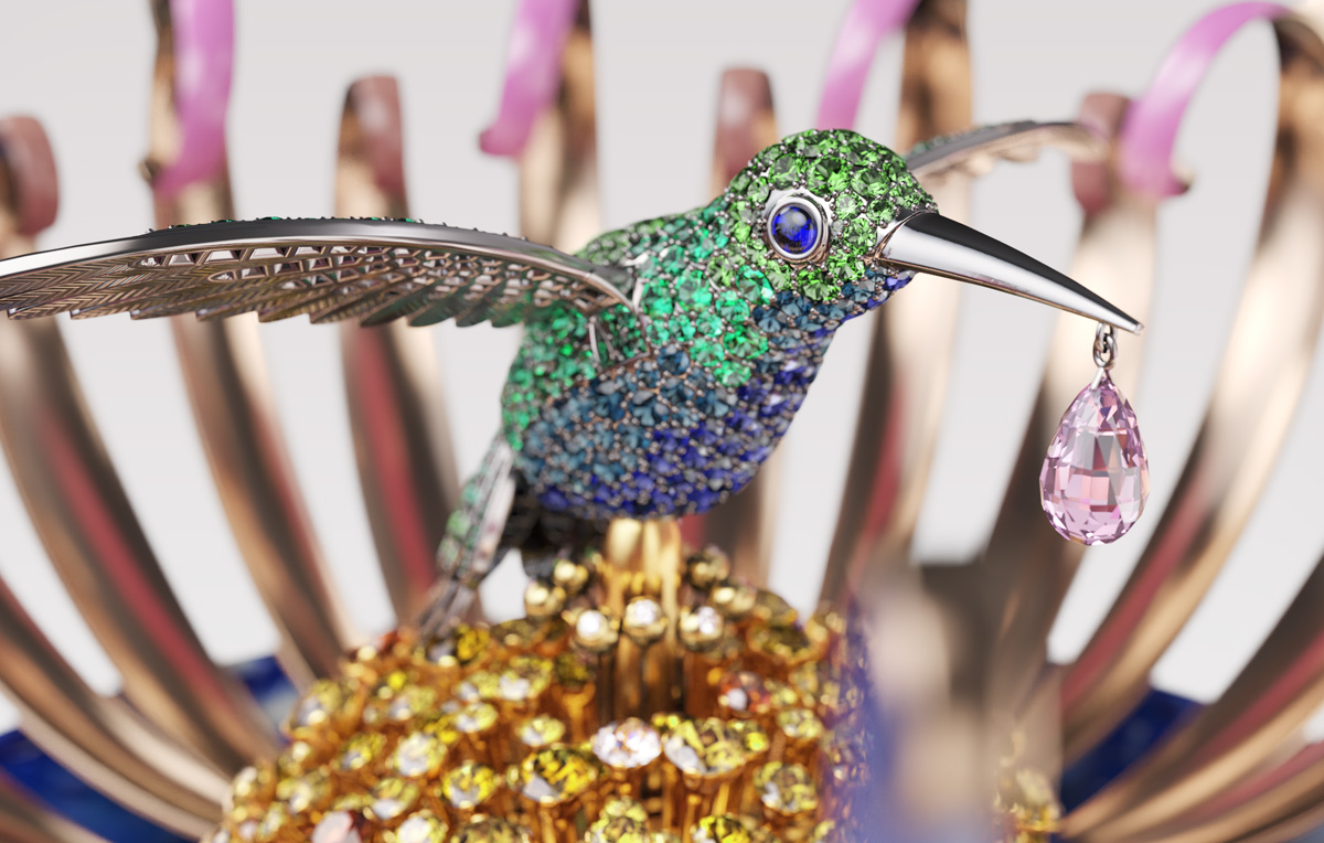Some 30 centimeters high, the Rêveries de Berylline automaton presents a flower that blooms to reveal a fine winged creature. A flower born in an imaginary garden animates on demand, opening its petals to unveil a hummingbird ready to take flight.